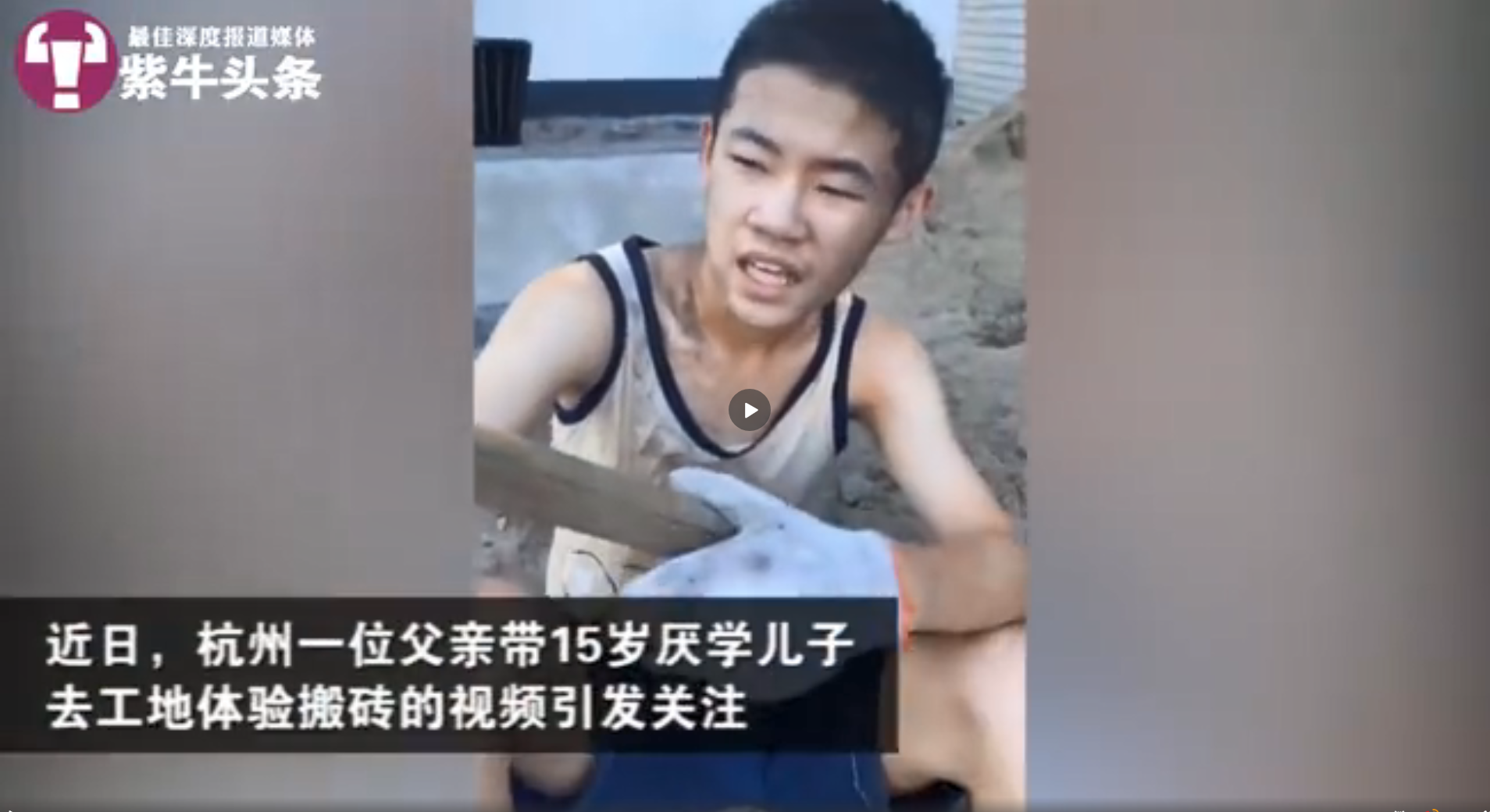 四月份时,一段视频突然爆红网络,一名父亲把自己厌学症的孩子送到工地干活。视频中的男孩喘着粗气,身上全是泥沙,瘫坐在地上。爸爸问他: